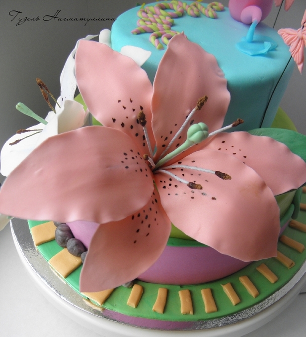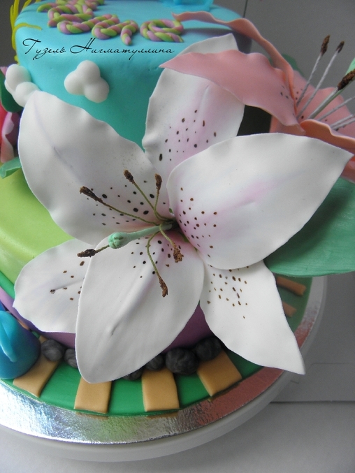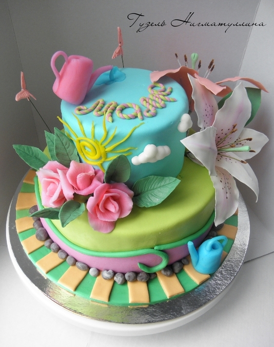 Торты для женщинРабота по эскизу. Мои дебютные цветы на проволоке... Что называется кустарным способом! Как же много мне надо: мат, проволоку разную, каттеры, молды, волшебную палочку)... Зато теперь, на своих ошибках и опыте, имею представление, что нужно прикупить в первую очередь! Встречайте работу моей сегодняшней бессонной ночи) не претендую на живость цветов и аккуратность, вообще торт течёт при такой влажности, жуть((( Всем замечаниям и советам буду признательна, обещаю не спорить и не оправдываться)