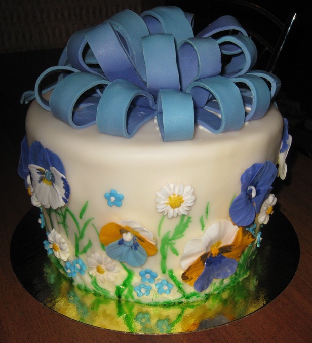 Не задалась у меня работа с этим тортиком, почему не знаю. Началось все с анютиных глазок, которые оказались для меня не такими простыми, как выглядели сначала (возможно, из-за первого опыта работы с мастикой Сатин айс цветочная). При сборке торта полопались коржи и расползлись в разные стороны, побежала срочно в магазин за продуктами и стала печь снова, крем на всякий случай сделала другой (да и маскарпоне в нашем маленьком городке не найти). Из-за влажности мастика для обтяжки была очень липкая, порвалась у меня в нескольких местах, к тому же никак у меня не получается обтянуть торт без складок. Бант делала из мастики полен, красила сама гелевым красителем вилтон, в итоге, верхняя часть поменяла цвет, как бы выгорела (на солнце бант не сушился, но дневный свет на него падал). Больше всего я запаниковала при сборке банта, нижние ряды начали ломаться под тяжестью верхних, хотя ленточки до сборки сохли двое суток, списала опять на высокую влажность))) Когда дело дошло до раскраски, не было уже никаких сил и настроения, понимаю что очень не аккуратно и это его портит. Но девочка, по заказу которой его готовила была довольна и гости тоже. P.S. заказы принимаю за минимальныю стоимость и предупреждаю, что я учусь, многое не получается из задуманого, к тому же заказывают только знакомые. (Фото выбрала самое удачное, остальные хуже))))