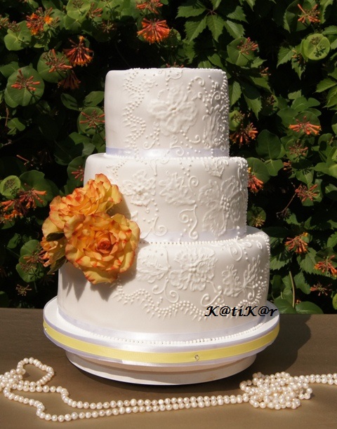 Юля, ужас не то слово - мне стыдно выносить торт к заказчикам, хочется сквозь землю упасть((( Торт слабый, хоть реж меня - в некоторых местах с выравниванием накосячила, потому что утюжок моментально прилипает к сырой мастике и начинает её тянуть, а не ровнять...Вышивка растеклась...Летом не текут только чизкейки, им вааще погодные условия до фонаря, хоть на них переходи)))