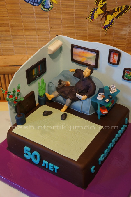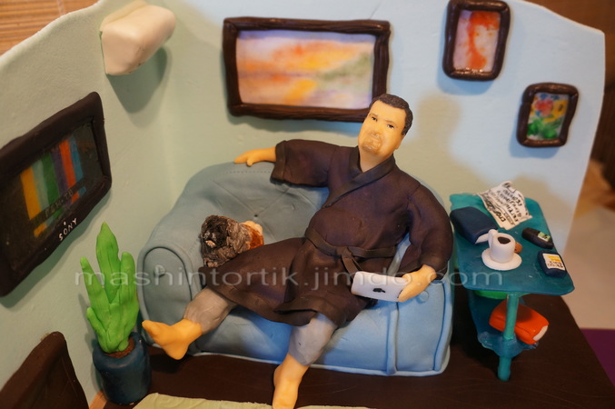 Торты юбилейныеВес 6,9 кг, крем брюле с черносливом, белковый заварной с вишней, маскаропоне с миндальными лепестками и жемчужинами в белом шоколаде (спасибо Трине). Портретная лепка, в т.ч. собаки :) Заказчики сказали, что все очень похожи :)) Предметы и обстановка - реалии именинника :))