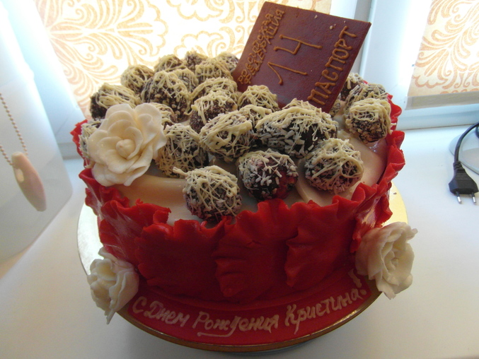 Проба пераВот такой рафаэлло с клубникой в шоколаде отправился на 14-тие дочки знакомых. Изначально идея была сделать коробку, но видимо из за жары мастика по краям плыла (вся ночь прошла в борьбе с мастикой), и вот т ак я вышла из положения, Друзья довольны , ребенок тоже, а вот у меня осадочек остался.................