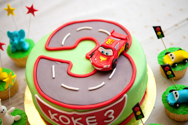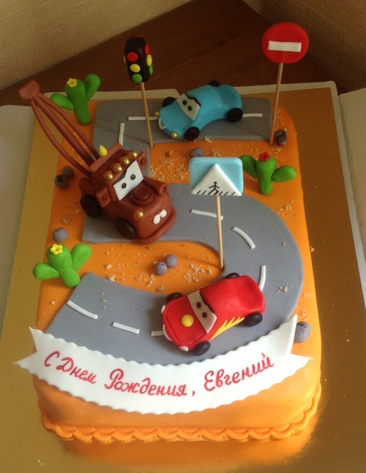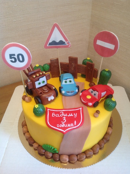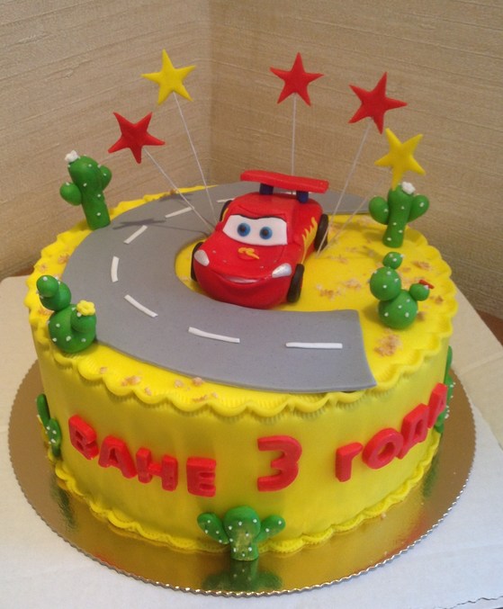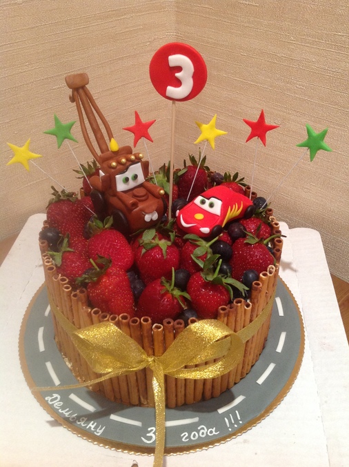 Вот точно не помню, у меня тортов просто очень много, делала обычные машинки тачки красную и голубенькую, но только торт был такой для девочки- цветочки- бабочки, божьи коровки и тд, веселенький