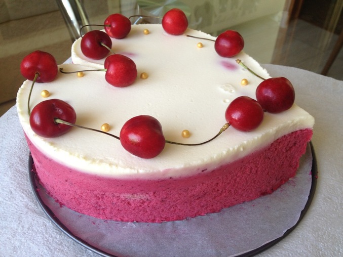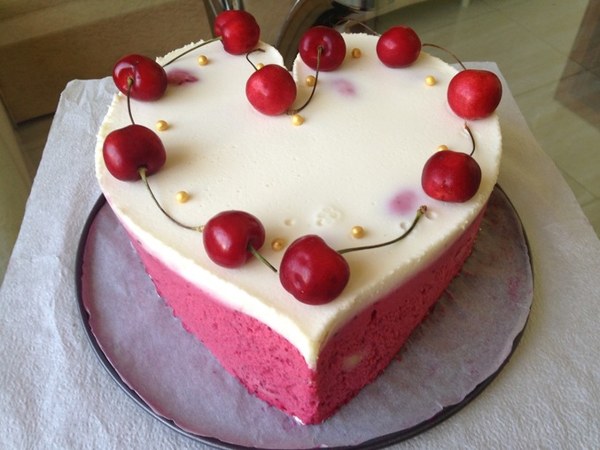 Сердечко - клюквенный мусс, скрывающий крохотные профитроли со взбитыми сливками, покрытый муссом из белого шоколада.