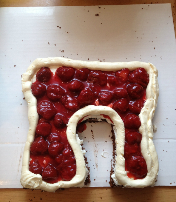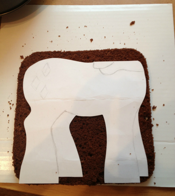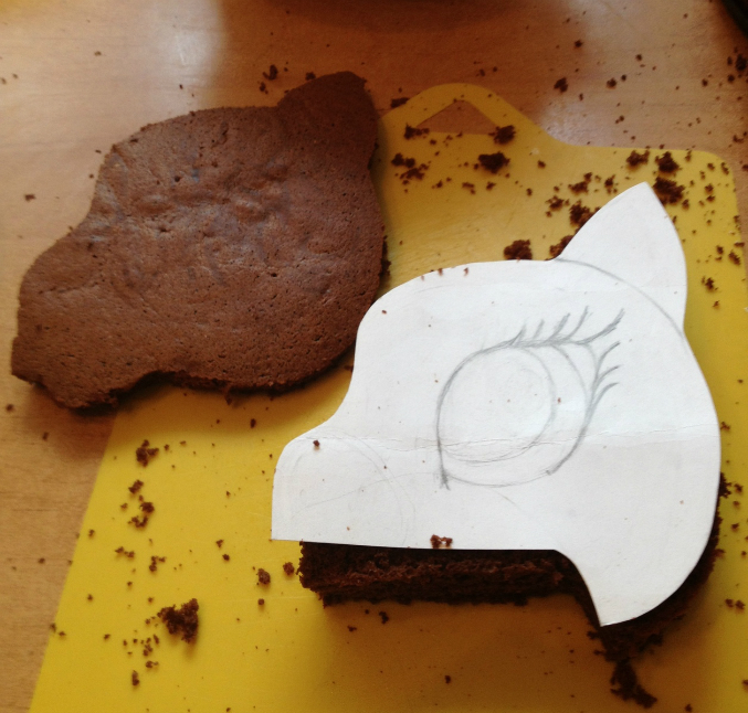 Накрываем коржом, промазываем клубничным кремом. После чего отрезаем у бумажного шаблона дальние ножки и вырезаем коржик