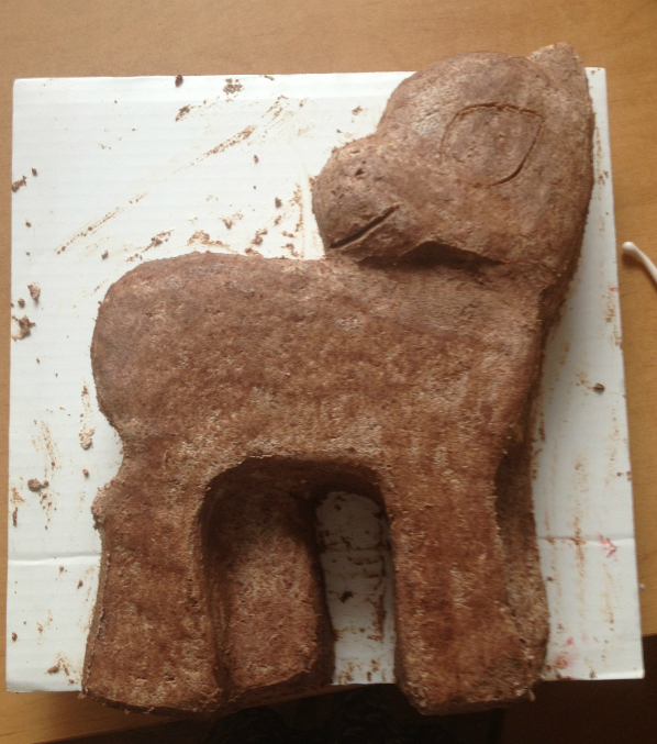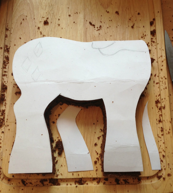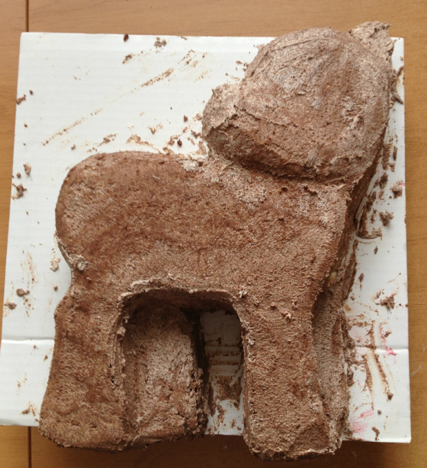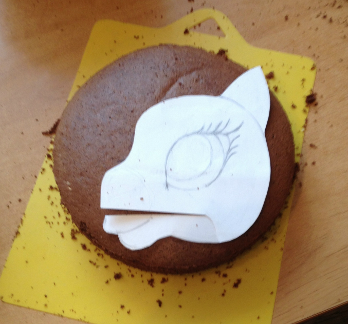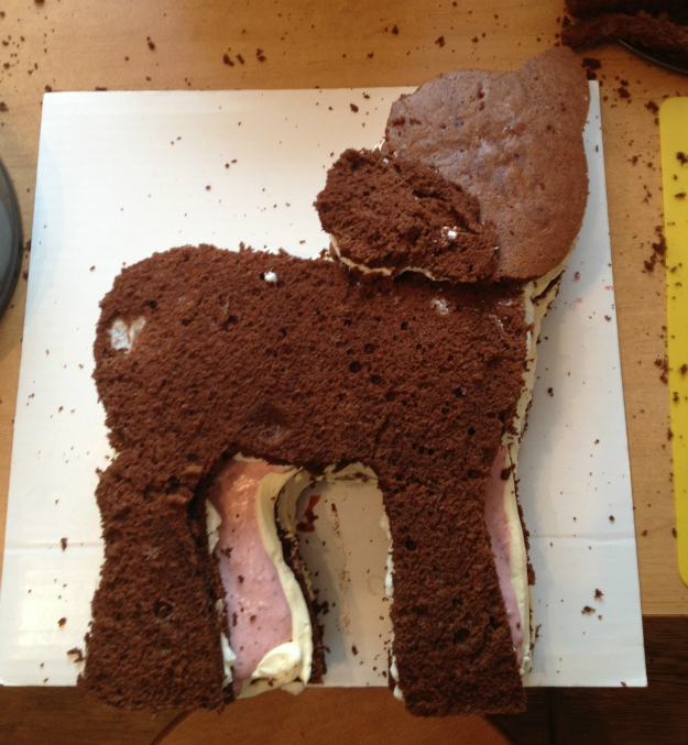 Здесь видна моя ошибка с кремом.Весь клубничный крем, который здесь видно, я убрала, т.к. ножки надо обмазать под мастику. Голову собирала также как и тело. Здесь видно, что на мордочке я положила ещё кусок бисквита для того, чтобы сделать её менее плоской. Кусок уха я срезала(здесь ещё оно целое), чтобы оно было ниже мордочки. После чего приступила к обмазке. Обмазывала картошкой и нарастила чуток изгиб на задней ноге