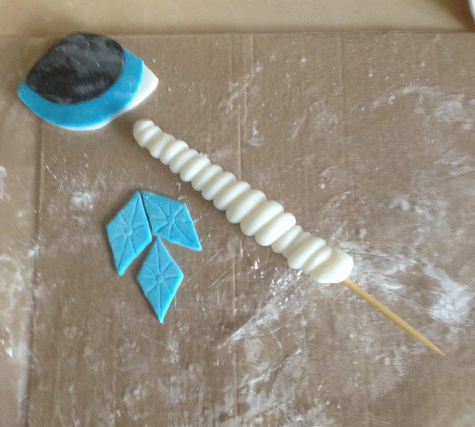 Пока тортик застывал, сделала глаз и рог. Глаз также вырезала из шаблона и делала как аппликацию. Рог - это половина шпажки. Наматывала на слегка влажную шпажку, начиная с кончика(верха рога). Также вырезала ромбики и расчертила как в мультике, чуть покрыла кандурином.