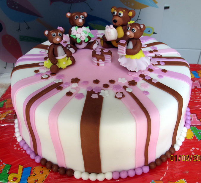 Внутри шоколад на кипятке, клубничный мусс и клубнично-шоколадный ганаш, весил около 4 кг вместе с фигурками. Медведи - это семья моей сестры - она с мужем и двумя дочками:)))