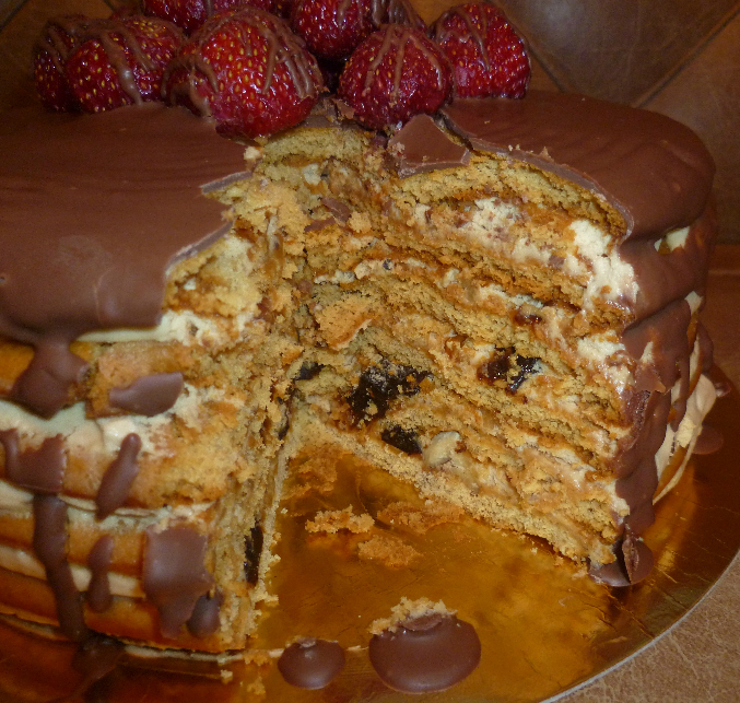 Внутри медовик, сливочно-сметанный крем с варёной сгущёнкой, чернослив, грецкие орехи.