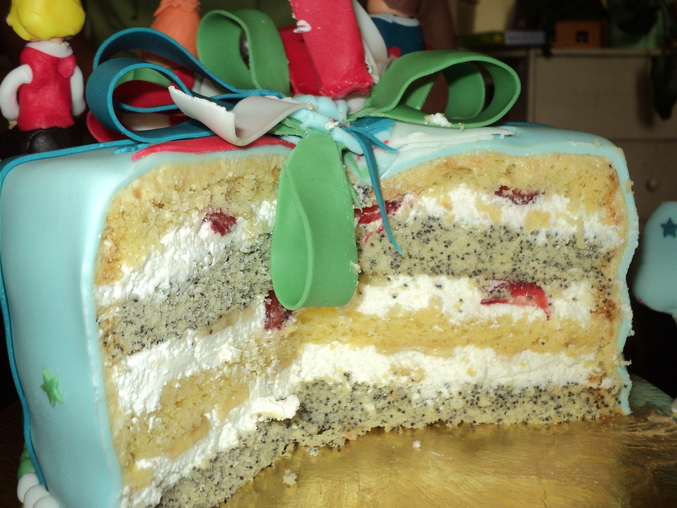 Вес 2,5 кг. ВАнильный и маковый бисквит, творожно-йогуртовый крем, клубника и банан