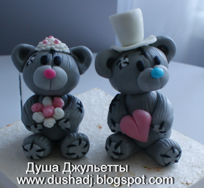 Делала я свадебный тортик. Чемодан. А на нём медведи вот эти... только сам торт я сфоткать забыла, теперь жду фотоотчёт от молодожёнов :)