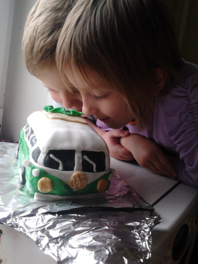 приятно, что детки такие счастливые! если не против, дам пару советов. 1. выравнивание. очень жаль, что вы совсем-совсем не ровняли тортик - был бы замечатленый автобус; 2. подложка. понятно, что не обязательно покупать подложку, делать ее самой, если печете не часто, но лучше было сделать тортик на той же доске разделочной для овощей (не для мяса, конечно) - смотрелось бы гораздо аккуратнее. В целом все не плохо: автобус узнаваем, все детальки на местах, но, конечно, такое фото я бы не выкладывала, а просто показывала бы друзьям в дневнике - у нас есть риск получить жесткую критику, а недостатки этого торта вы и сами знаете, "начинающий" и "срочный" для такой работы не оправдание - смотрите первый тортик такого же новичка в виде сердечка с кошками сегодня в ленте. в вашу поддержку скажу, что моя первая машинка была не намного лучше и стояла в разделе "критика", ведь все мы здесь учимся. кстати, ваш тортик с Микки очень даже хорошенький, так что нечего тут заливать, что не успели выровнять (за пол-часа-то такую форму уровнять до идеальной можно) или "самоучка" (здесь все такие). успехов вам!