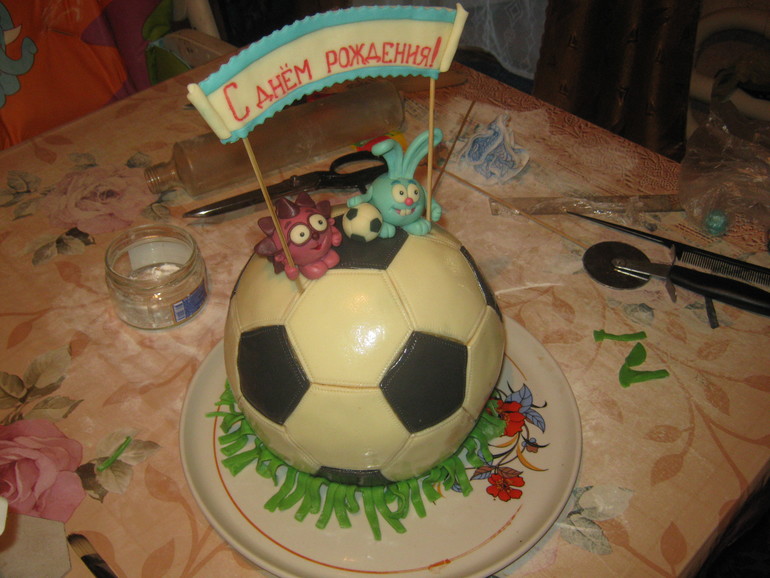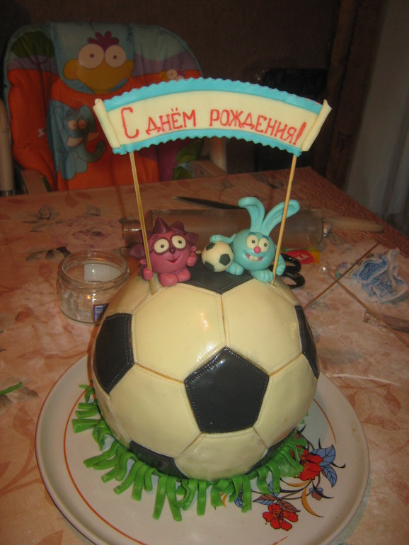 Знакомая девочка попросила испечь сыну ( 7 лет ) на день рождения.... хотелось им мяч и смешариков!! Ну и намучилась я с ним! А всему виной ганаш ( на 200 сливок домашних взяла 3 плитки молочного Россия (путешествие)( видимо что то не правильно сделала... или жара) Вообщем таял как хотел... пришлось все снять и намазать масло + сгуха... ну и все равно немного таял... Щас покажу что было!