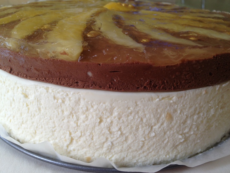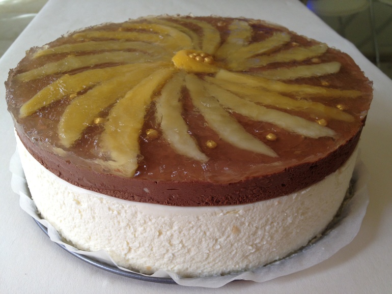 На День рождения своей лапушки сделала вот такой торт. Нижний слой: шоколадный бисквит с шоколадно-ореховым ликером, покрытый муссом из сливочно-сырного крема и манго. Верхний слой - мусс из темного шоколада. Украшение - дольки манго в желе. Лично мне такое сочетание вкусов понравилось).