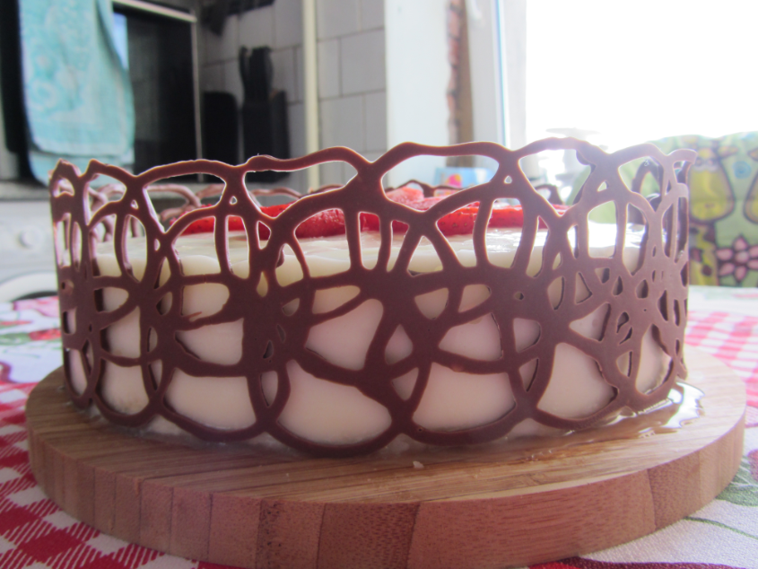 Ещё косяк с моей стороны был в плане заливки йогуртом с желатином. Я не дождалась, когда начнёт хорошо желироваться и вылила в форму, а поскольку форма была больше диаметром, чем торт, то я из плотной полиэтиленовой упаковки (ну, коробка у нас была большая, упаковочная)сделала бортики - выше торта и чуть шире его по диаметру, но меньше диаметра формы (Ну нет у меня несколько форм разного диаметра). Так вышло, что у меня заливка под этот бортик вылилась в саму форму - пришлось собирать ложечкой, когда чуть ещё желатин прихватился и аккуратно складывать внутрь бортика. Так что заливка застыла не ровно-глянцево, а чуть комочками. На будущее я все эти нюансы на ус намотала, больше таких ошибок не повторю. Что с шоколадом - нарисовала, как Инночка показала - на пергаменте. Шоколад никак не хотел застывать. Я достала из морозилки элементы холодовые для сумки-холодильника, выложила их на стол, сверху - ленту с шоколадом. Застыл за полминуты Ещё пришлось ждать, когда немного обмякнет. Ну и кусочек в процессе отломился - никак не захотел приклеиваться. Обидно было только мне. Муж сказал, что красиво, спору нет, но резать с шоколадом неудобно, ломается, да и вообще, он не любитель шоколада.