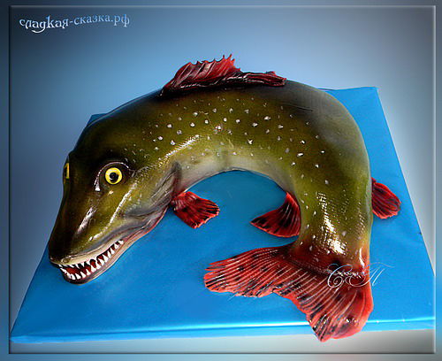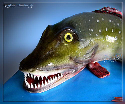 Торты 3ДСамые любимые торты у меня - 3D. А торты для рыбаков - особая любовь! Вот очередная, "пойманная" мною хищница, внутри которой белый ванильный бисквит, сливочный крем, прослойка клубничного джема и ананасы))
