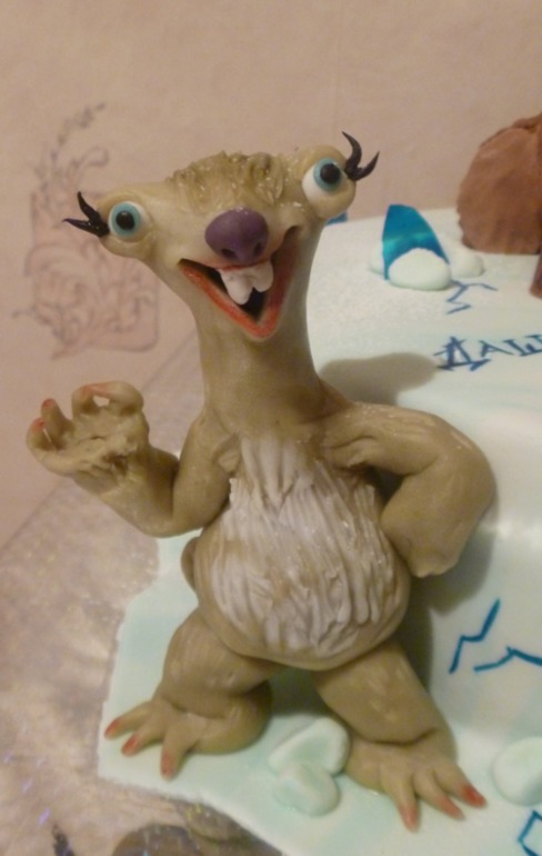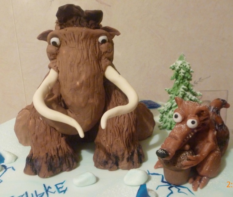 Внутри медовик со сливочно-сметанным кремом, грецкие орехи, чернослив.Вес 2.8 кг. В мамонте-лепильная масса.
