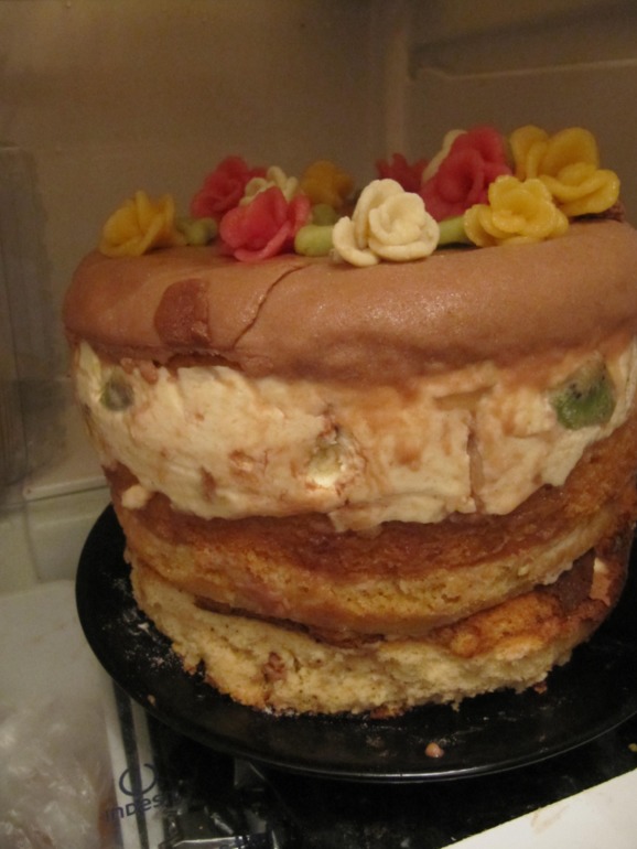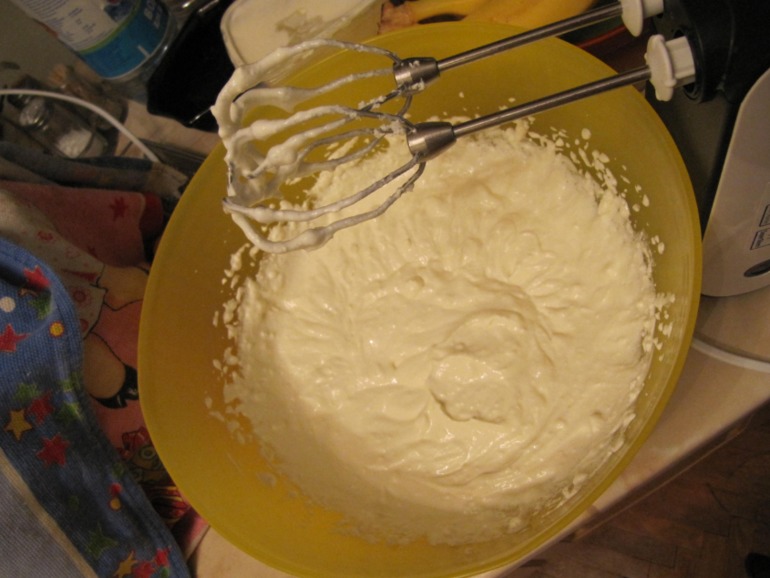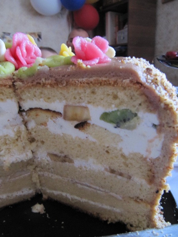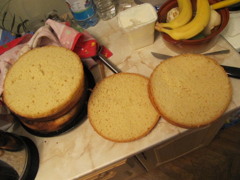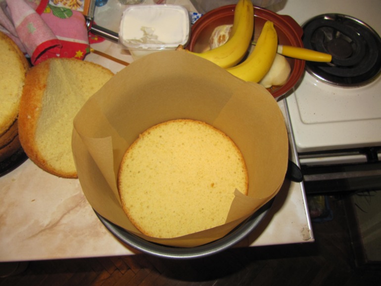 вот в принципе и готов тортик. и можно бы его украшать. но у меня еще остались коржи!!! и муж сказал делай высоченный. всё съедим. нечего коржам лежать. поэтому я на след день взбила сметаны с сахаром и творогом. туда бананов. и доложила оставшиеся коржики.