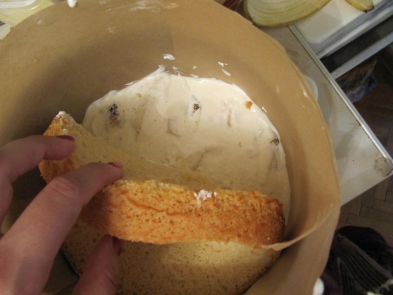 взять форму высокую. бока выстелить пергаментом. на дно положить одну из половинок коржа.