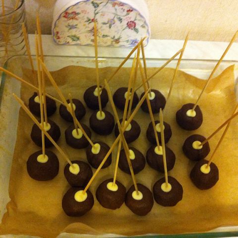 биквит:6ст ложек мук, 6 ст ложек сахара, 3 яйца, 100гр сл масла,100гр горького шоколада,1ч л разрыхлителя;в чашке растопить шоколад в кипятке+ масло, затем добавить сахар, яйца и муку с разрыхлителем, выпекать при 140 гр 40 минут. Взбить 100 гр сливочного масла и сгущенки, но мне показалось этого крема многова то. Остывший бисквит перемолоть в блендере и смешать с кремом, сформировать шарики и в холодильник, затем растопить белый шокода обмакнуть туда палочку и вставить в шарик, затем в холодильник на пару часов и украшать.