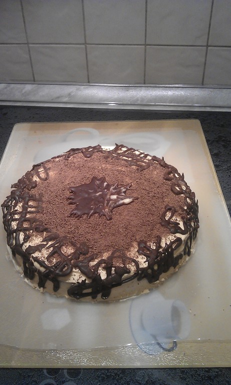 итак собираем торт в таком порядке 1 бисквит,2 арахисово -шоколадный слой, бисквит, крем тирамиссу.Даем тортику отстояться, часов 5, лучше на ночь в холодильник, украшаем шоколадными пластинами и какао порошком. Торт хоть и требует много времени, но поверьте он стоит того!