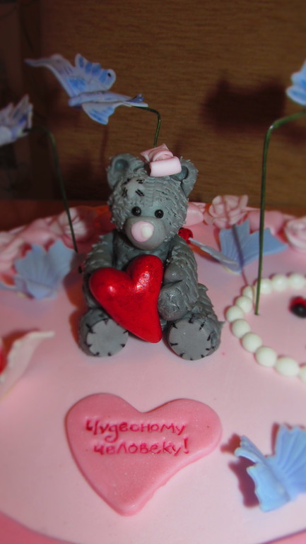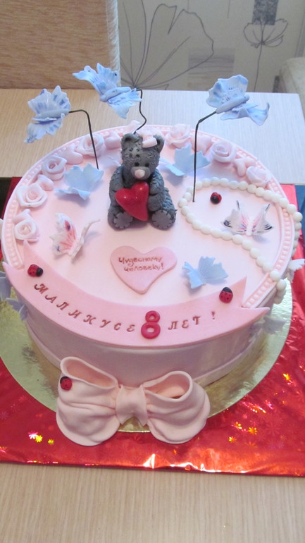 Татьян, в целом (насколько видно по не очень удачному фото) торт получился: ровненький, девичий. но есть пара моментов: бабочки на зеленой проволке (убрать) - это не красиво, проволка толстая, изогнута не натурально; посмотрите повнимательнее на мордочку мишки Тедди на картинке - у вашего форма морды совсем не похожа.