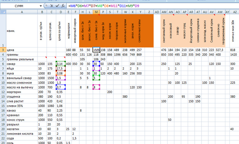 вот мои наработки (цены в тенге, тенге в 5 раз дешевле рубля). я некоторые колонки скрыла, чтоб было нагляднее, а так у меня таблица пошире (больше колоночек). в будущем все таки планирую на каждый торт сделать таблицу, так как бывает заколупывает каждый раз один и тот же состав плюсовать. Но вот плюс в этой таблице в том, что крема бывает уходит то больше в зависимости от формы, то меньше на один и тот же состав торта (а еще бывает в один торт 2-3 крема заказывают), так вот по этой таблице посчитать быстро себестоимость не проблема.