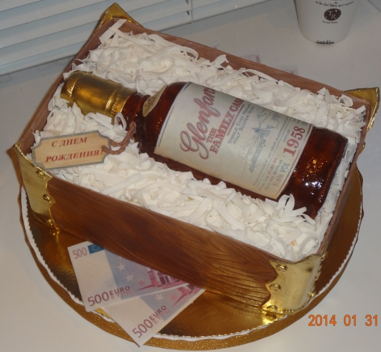 Отличный тортик! Бутылка как настоящая? Она внутри пустая? А что за краситель такой золотой на пробке?