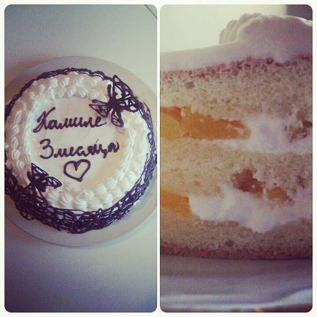 бисквит классический, крем белковый с сахарным сиропом, по вкусу как меренга, персик из банки и пропитала соком от персиков коржи. Правда суховат получился, боялась с пропиткой переборщить. Крем мне как то не очень понравился, буду пробовать другие)Украсила шоколадом растопленным. Все просто. Всем домашним понравился, так что для первого торта считаю неплохо вышло) Завтра буду медовик делать