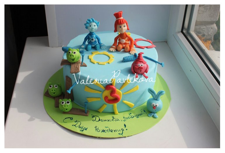 Торты детскиеСпрашиваю у сына, ему исполнилось 3 года,Какой ты хочешь тортик и заказали Фиксиков , Смешариков и Злых птичек(а именно хрюшек) И вот что получилось))