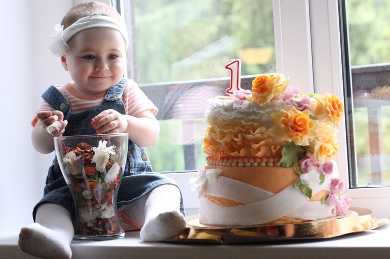 КритикаВот такой тортик у меня получился на годик доченьке. Два яруса. 8кг. Делать было сложно конечно длч новичка, Розы начала делать за неделю, потом другие цветы, за 3 дня начала печь бисквиты и коржи для наполеона за 2 дня.. В общем на все ушло 5 дней.