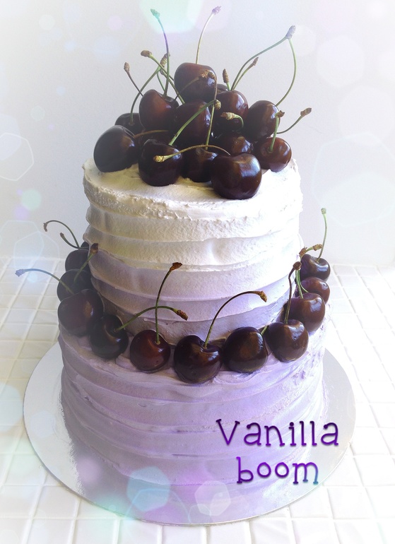 Довольна первым опытом)) над начинкой особо не стала заморачиваться, низ- ванильный бисквит, лимонный курд и крем сливки-маскарпоне; верх- ванильный бисквит, творожный крем и бананы. Декор-белковый заварной и черешня.