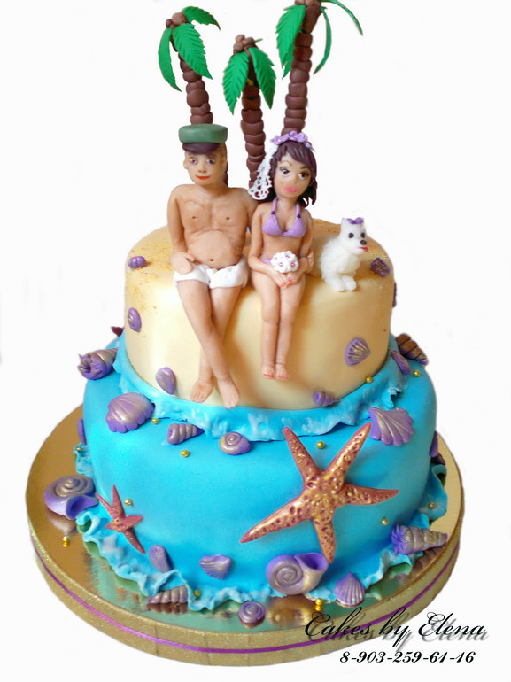 Торты свадебныеНу в общем что получилось, то получилось... 5300 гр низ "черный лес", верх - холодный чизкейк. Требований к дизайну было предостаточно - парочка в купальниках и с собачкой, он - военный, с животиком, она- стройная брюнетка, ракушки фиолетового цвета - цвет платья невесты) Фигурки пока у меня плохо получаются, да и лепила в сокращенном режиме времени, заказ был за два дня... Заказчики остались довольны, я как всегда - не очень...