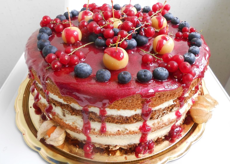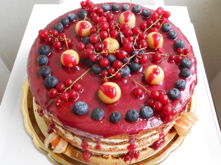 Сверху малиновая глазурь с фруктами.