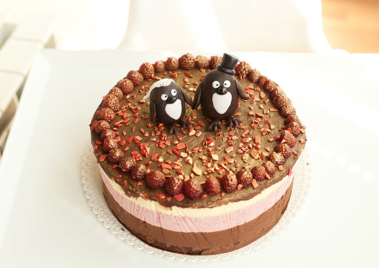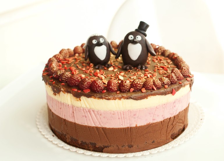 не большой тортик на скорую руку. Шоколадный брауни,мусс шоколадный,мусс малиновый,мусс ванильный.