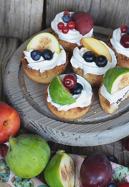 Песочные корзиночки с конфитюром, кремом и фруктами.
