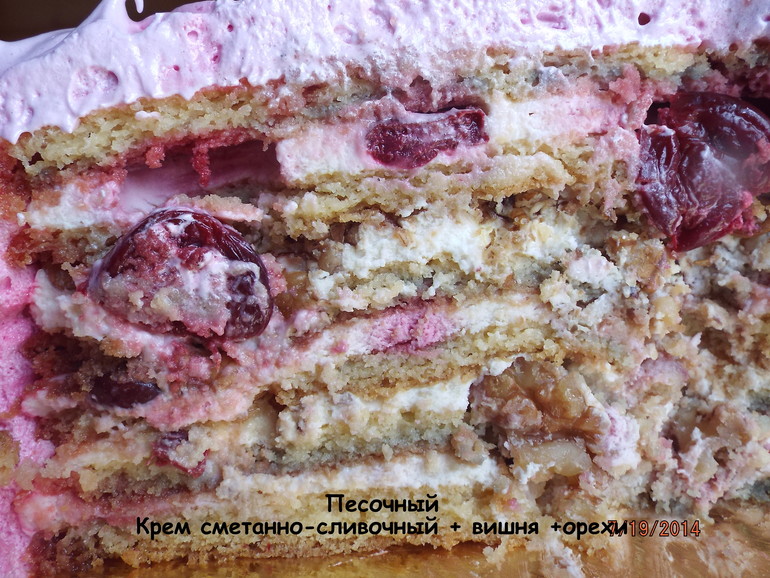 Проба пераТорт песочный от ТОРТАЛЕНЫ,за что большое спасибочки..у меня торт песочный был в памяти сухой и невкусный..результат меня конечно очень порадовал,нежный,хорошо пропитанный торт..ммм....разрез под катом..вишни много,орехов много,я их обожаю,и добавляю всегда))