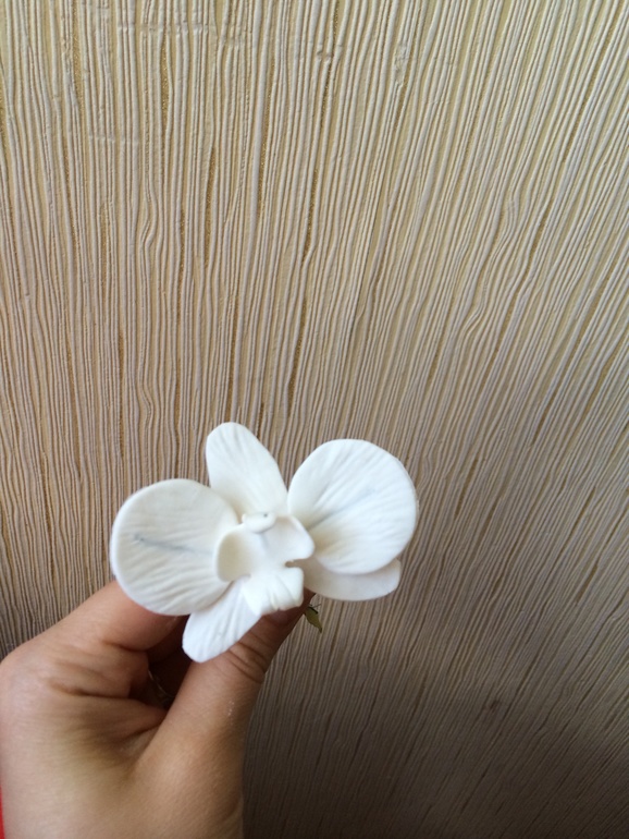 Вы сравните с настоящим цветком орхидеи, откройте картинку... думаю сразу все сами увидите. Форма листьев не такая у нее...листья боковые не круглые. Сами края — надо тончить, мастика вообще оооочень толсто раскатана... ну и проволока должна быть белой и должна входить где-то на 2/3 лепестка, а не до конца. А вообще смотрите на картинку — и делайте по ней.