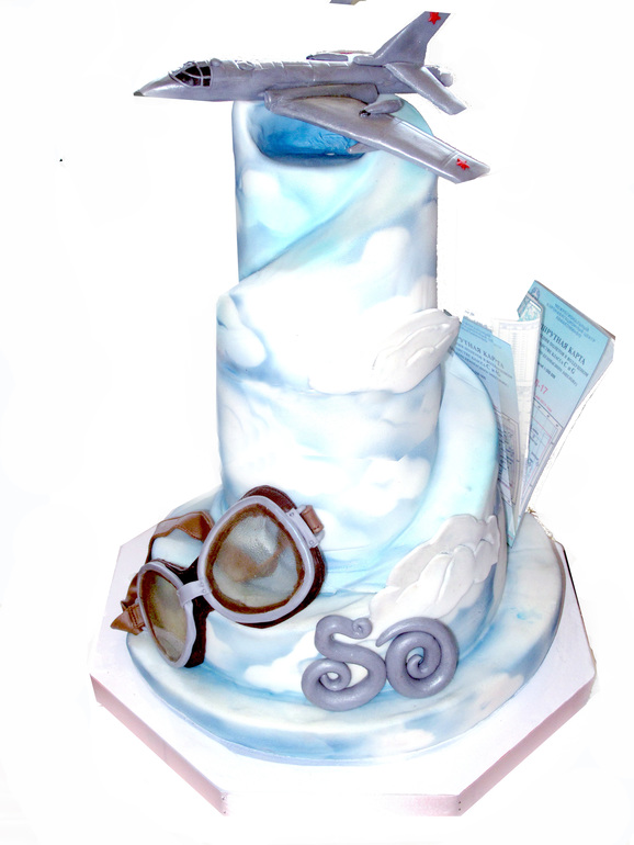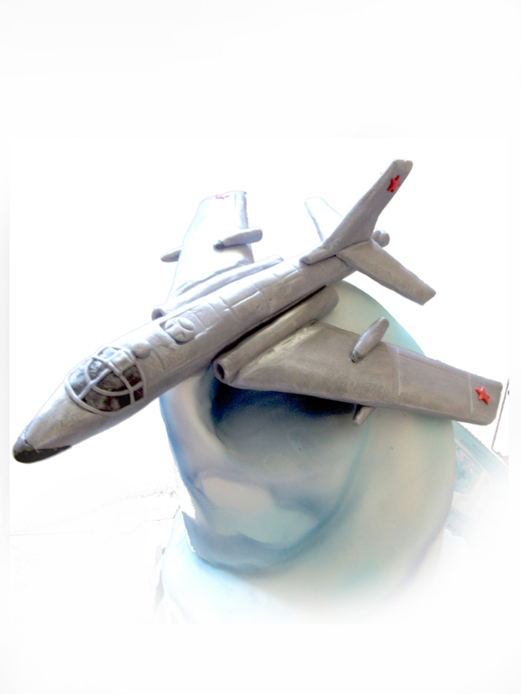 Торты для мужчинНа юбилей профессионального военного летчика. При кажущейся простоте этот 9-килограммовый полет ТУ-16 изрядно попил моей кровушки. Высота конструкции 55 см-в морозильник не влезала по определению, поэтому от идеи покрытия велюром пришлось отказаться еще на этапе дизайн-проекта и изголяться с покрытием мастикой.Для себя рещила, что спиральных тортов выше 2 ярусов впредь- ни-ни,так что считайте, эксклюзив показываю))))