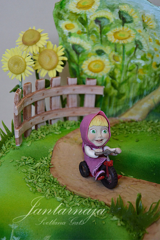 Торты детскиеДелала торт Маша и Медведь по вот этой картинке, результатом, если честно на данный момент очень довольна. Сложней всего было "поймать" лицо Маши, но вроде справилась. Велосипед, кстати полностью делала, но Маша всю красоту платьем закрыла. Внутри торта красный бархат, вес 2,5 кг