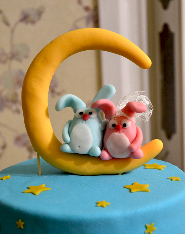 Торты свадебныеИдея тортика была навеяна подарком подруги на свадьбу: картина, где на луне сидят зайчата, а вокруг них звезды (каждый гость оставлял отпечаток пальца на звездочке), а снизу надпись "Люблю тебя до луны и обратно..."