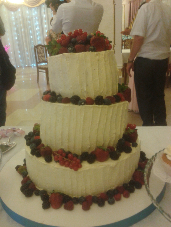 Состав значит написала, дальше торт был выровнен картошкой,охлажден-масло все застыло я не торопилась, все делала с нормальным интервалом во времени, дома покрыла кремом вот этим мне он очень нравится, хорошо держал форму и я им не раз уже украшала! Покрыла значит, сделала полосочки, Охладила! каждый ярус на своей подложке, вставила трубочки для укрепления ярусов и в разобранном виде повезла в кафе! Конечно крем держал форму и был твердый, но после транспортировки стал мягкий,температура воздуха была за 30 точно!и в кафе не прохладно, хотя кондиционер сказали включен! ОЧЕНЬ ОЧЕНЬ тяжело было его собрать на месте, крем конечно не мастика, пришлось все полосочки делать еще раз на втором и третьем ярусе, крем мягкий! уложила ягоды себе сфоткала на тел, конечно вид не такой как проф., но все же, все довольны уехала! крем начал застывать как-бы немного....