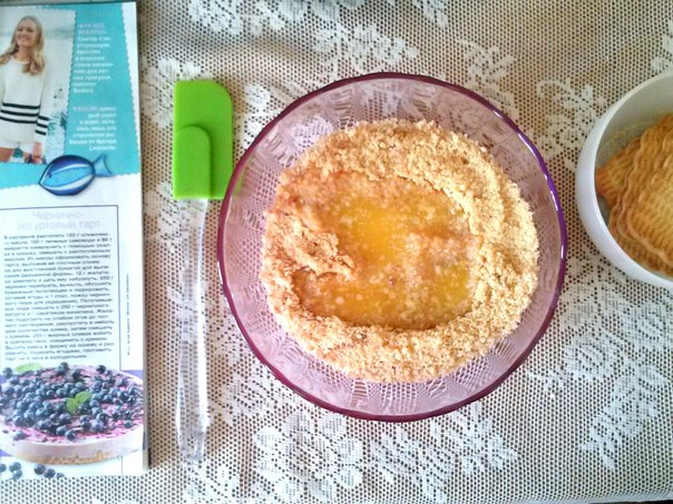 1. Масло растопить и смешать с измельченным в крошку печеньем. Полученную массу выложить на дно формы диаметром 12-15см, предварительно застелив ее пекарской бумагой.