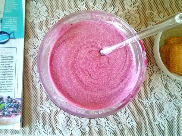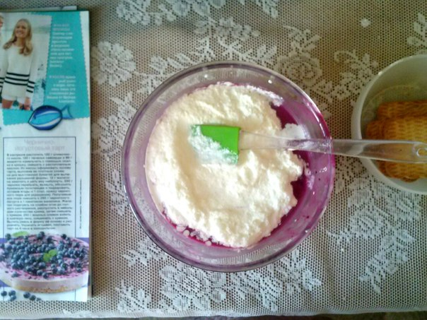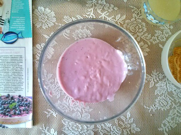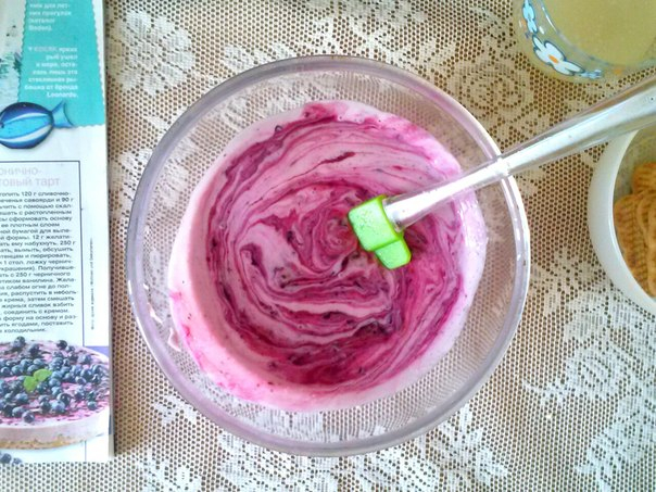 4. В отдельной посуде смешать смородиновое пюре и черничный йогурт. Добавить в полученную массу желатин и перемешать. После этого добавить в массу сливки, снова перемешать.