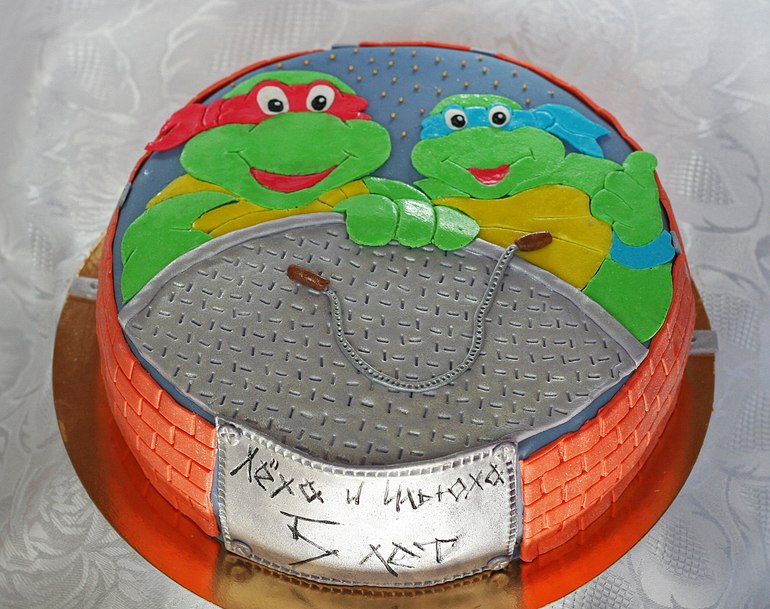 Торты детскиеБыстроторт, поэтому без лепки. Но аппликация мне даже больше нравится, реалистичней получилось. Правда муж посмеялся над нунчаками, сказал, что слишком по девчачьи выглядят, как скакалочка )))))))))))