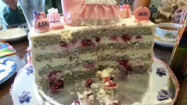 Ванильно-шифоновый бисквит с маком,творожно-сливочный крем,вишня с ванилью,грецкий орех.