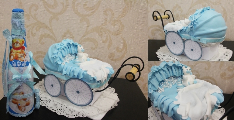 На выписку чудесного мальчика я сделала вот такой тортик - коляску. Сестра с радостью поддержала чудесной бутылочкой! Вот такой у нас союз получается:)
