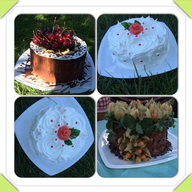 Один украшен ганашем второй белкового заварным , панчо и бисвит с муссом . Много черешни и персиков .