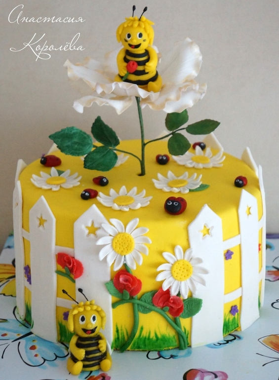 Тортик давался легко и просто, но почему-то не очень быстро! за идею взяла тортик Тани Крячко, но решила делать 2 пчёлок, а не одну. и вот - настал момент - в двенадцатом часу ночи всё доделала, цветок втыркнула, пчёл рассадила - вроде ничего, но на ночь решила не ставить в холодильник цветок! достаю цветок, одно неосторожное движение - и пчелка с цветка слетела и упала в раковину-прямо в кружку с водой (вот тот момент когда я пожалела что не вовремя мою посуду)))) естественно - всё личико растеклось, всё в черном - так обидно стало! ну думаю ладно хоть вторая есть-не зря лепила!