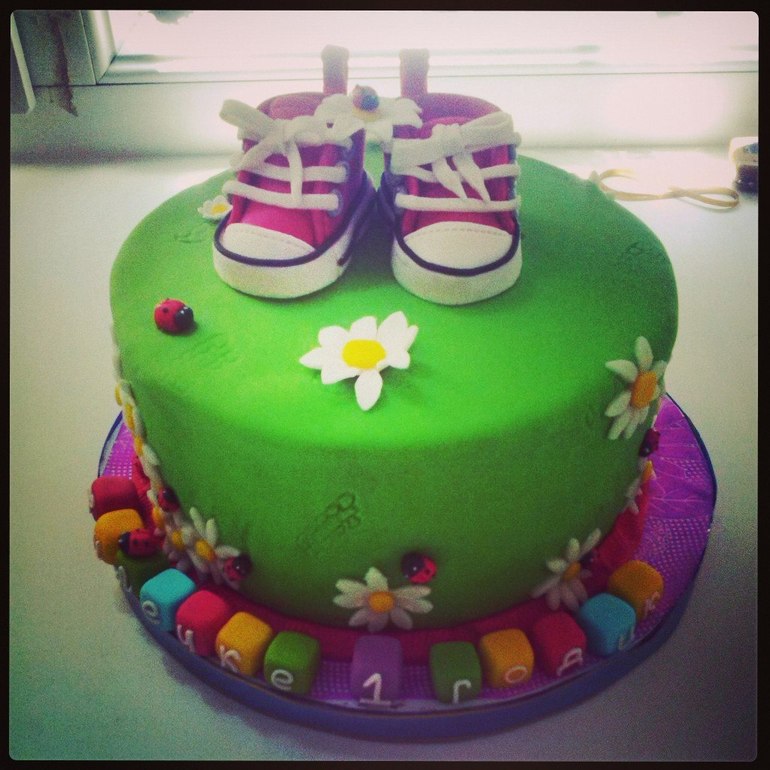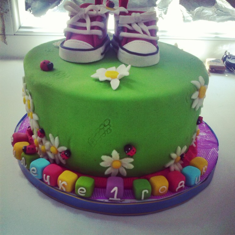 КритикаПосоветовалась я тут с вами ,девочки,по поводу тортика с кедами ...Цвет мастики белой я так и не дождалась,что бы сделать нежно салатовый цвет,пришлось в зелёную мастику жёлтый краситель добавлять,раскатала мастику и решила на ней отпечатать макаронами паровозики,так вот кода перенесла её на торт она во многих местах где рисунок стала рваться,пришлось кучей ромашек залеплять,хотя я слабенько нажимала............Инна,так я и не смогла как ты кеды поставить,у меня под носком кеда тортик проседает