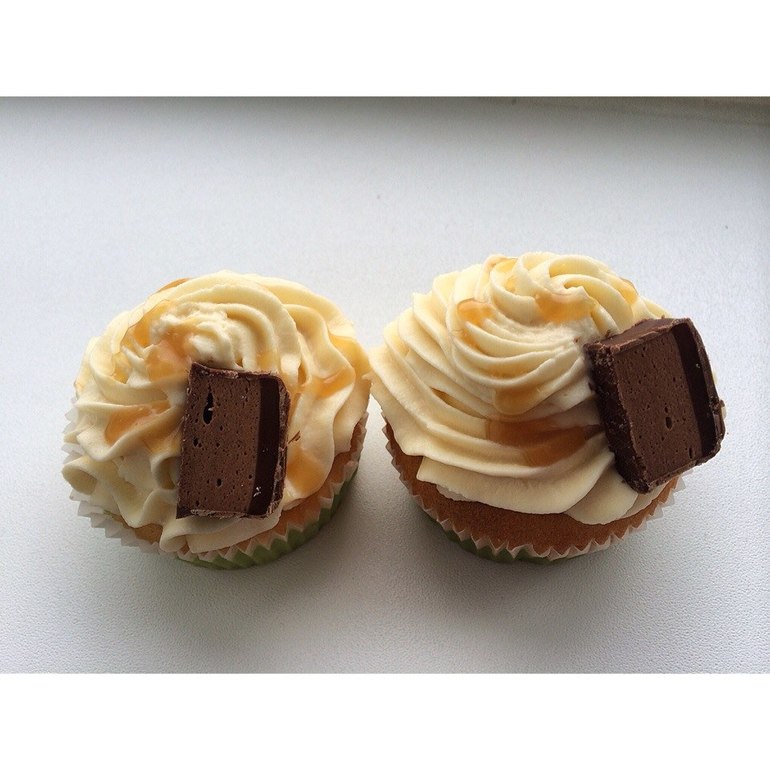 Капкейки, внутри карамель, сверху крема для украшения та же карамель и кусочки шоколада